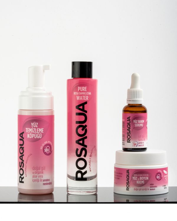 100 ml Rosaqua Saf Gül Suyu, Rosaqua Yüz ve Boyun Kremi, Rosaqua Yüz Bakım Serumu, Rosaqua Yüz Temizleme Köpüğü birlikte